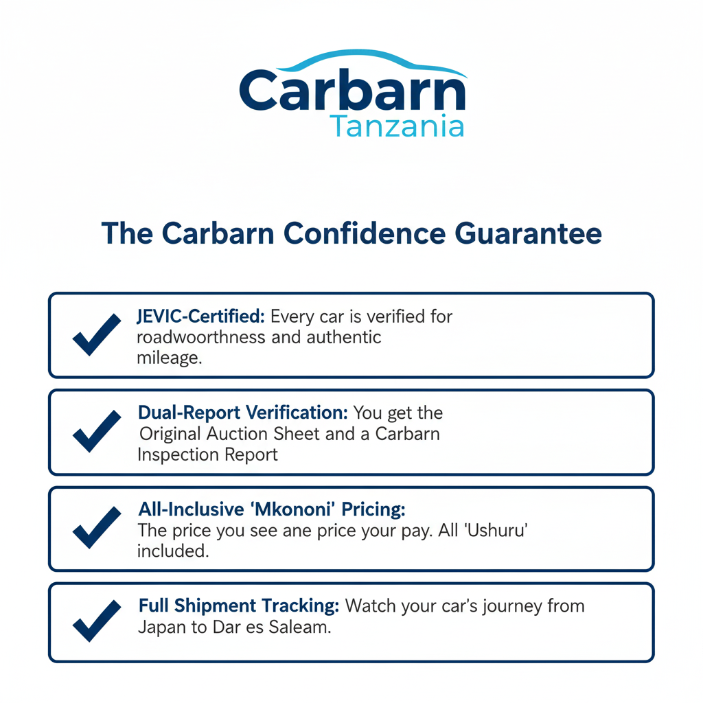 Your journey to a new car starts with trust. Stop guessing. Start driving. Browse our selection of JEVIC-certified, fully inspected vehicles at Carbarn Tanzania today. Know your exact 'mkononi' price before you commit. Click here to see our all-inclusive price arrivals.