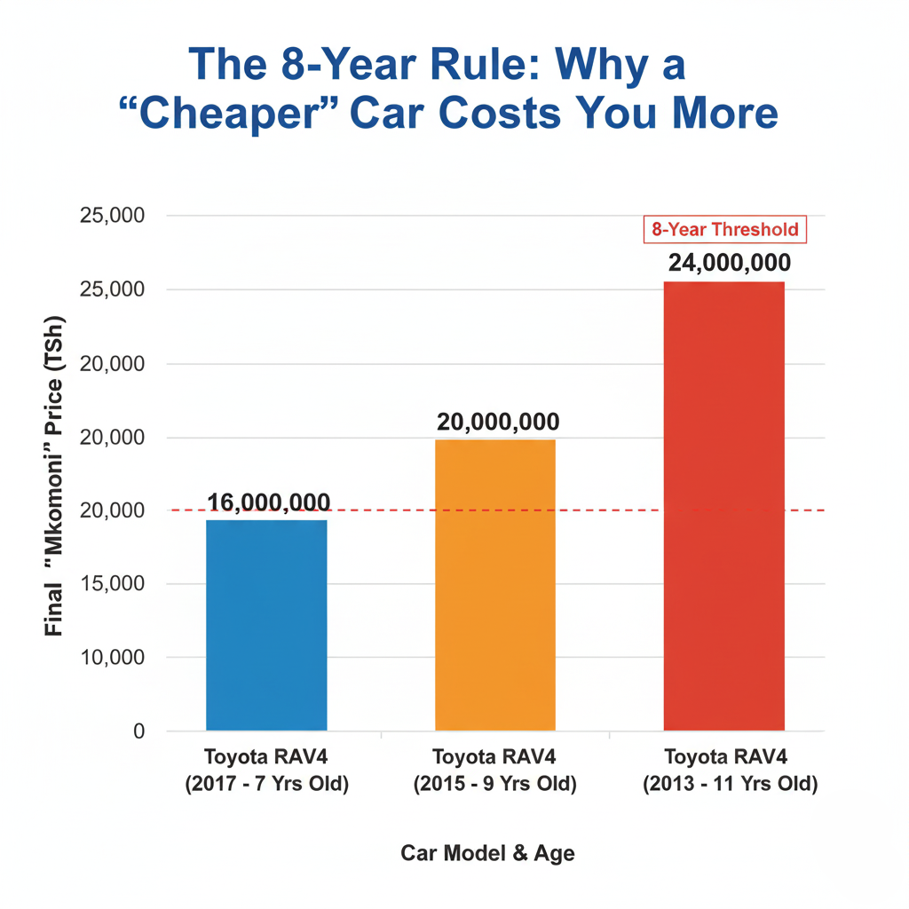 Tanzania has an "8-Year Rule". While it's not an age restriction (you can still import older cars), it's a severe financial deterrent. This rule adds an additional excise duty on top of all the taxes we just calculated.
